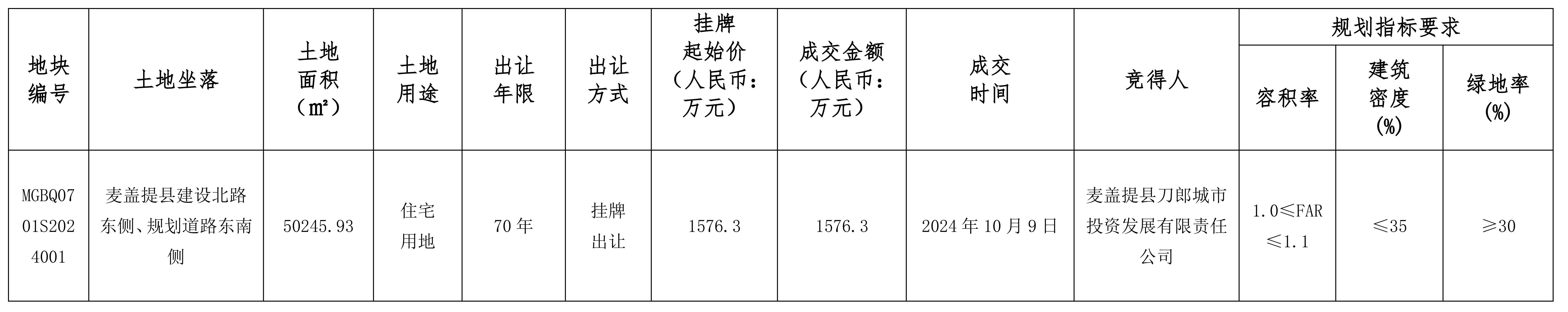 根據(jù)《中華人民共和國土地管理法》《招標(biāo)拍賣掛牌出讓國有建設(shè)用地使用權(quán)規(guī)定》(國土資源部令第39號)《自治區(qū)深化公共資源交易平臺整合共享工作方案〉的通知》(新政辦函〔2019〕250號)等有關(guān)法律法規(guī)及文件的規(guī)定,麥蓋提縣自然資源局以掛牌方式出讓1(幅)地塊的國有建設(shè)用地使用權(quán),現(xiàn)將出讓成交結(jié)果公示如下: