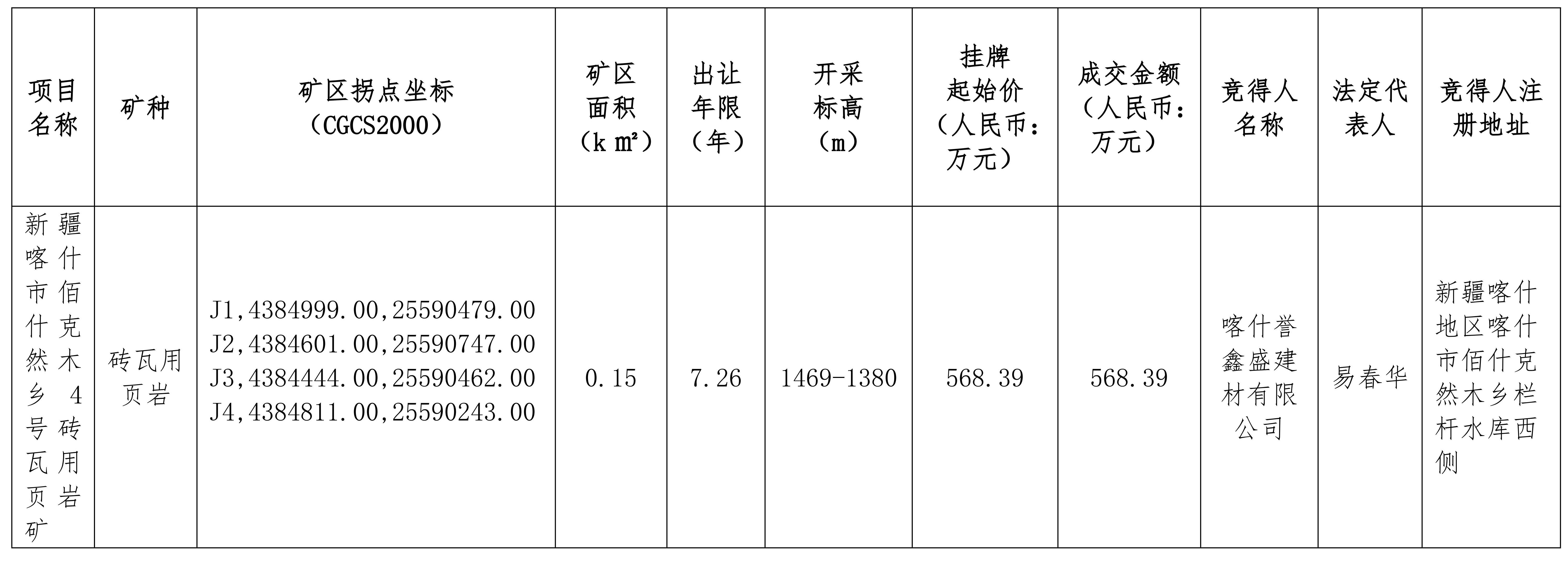 根據(jù)《礦業(yè)權(quán)出讓交易規(guī)則》等有關(guān)規(guī)定,按照《喀什地區(qū)采礦權(quán)掛牌出讓公告》(喀礦采告字〔2024〕8號(hào))程序,現(xiàn)將出讓成交結(jié)果公示如下: