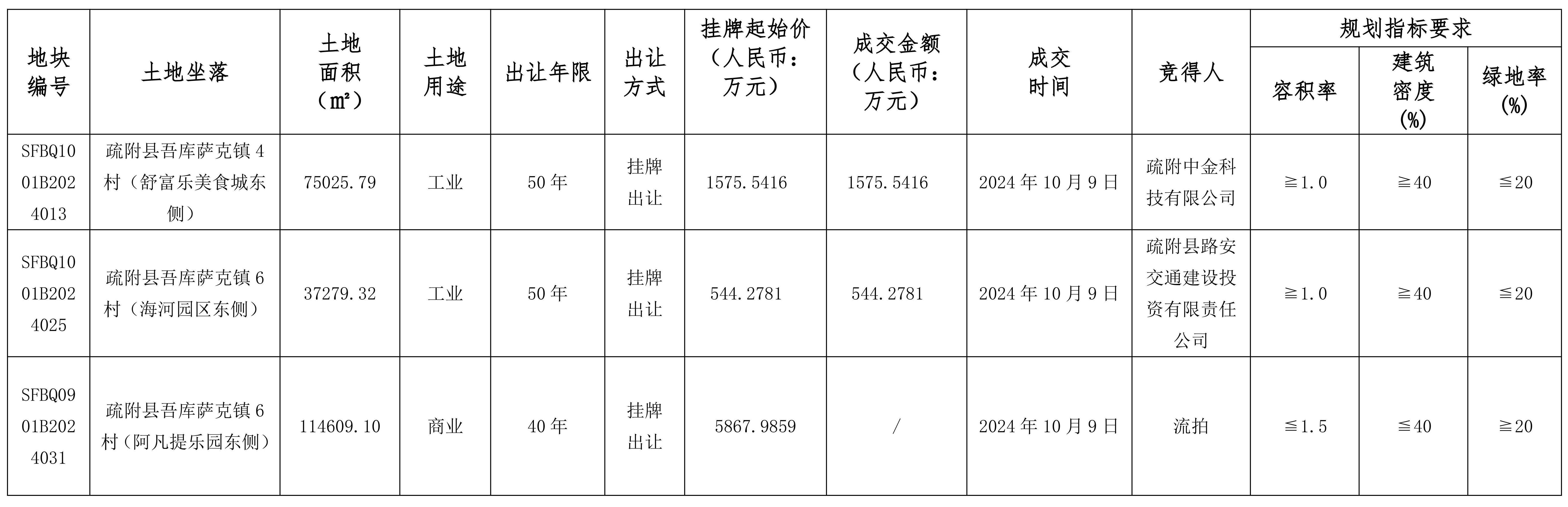 根據(jù)《中華人民共和國土地管理法》《招標(biāo)拍賣掛牌出讓國有建設(shè)用地使用權(quán)規(guī)定》(國土資源部令第39號)《自治區(qū)深化公共資源交易平臺整合共享工作方案〉的通知》(新政辦函〔2019〕250號)等有關(guān)法律法規(guī)及文件的規(guī)定,疏附縣自然資源局以掛牌方式出讓3(幅)地塊的國有建設(shè)用地使用權(quán),現(xiàn)將出讓成交結(jié)果公示如下: