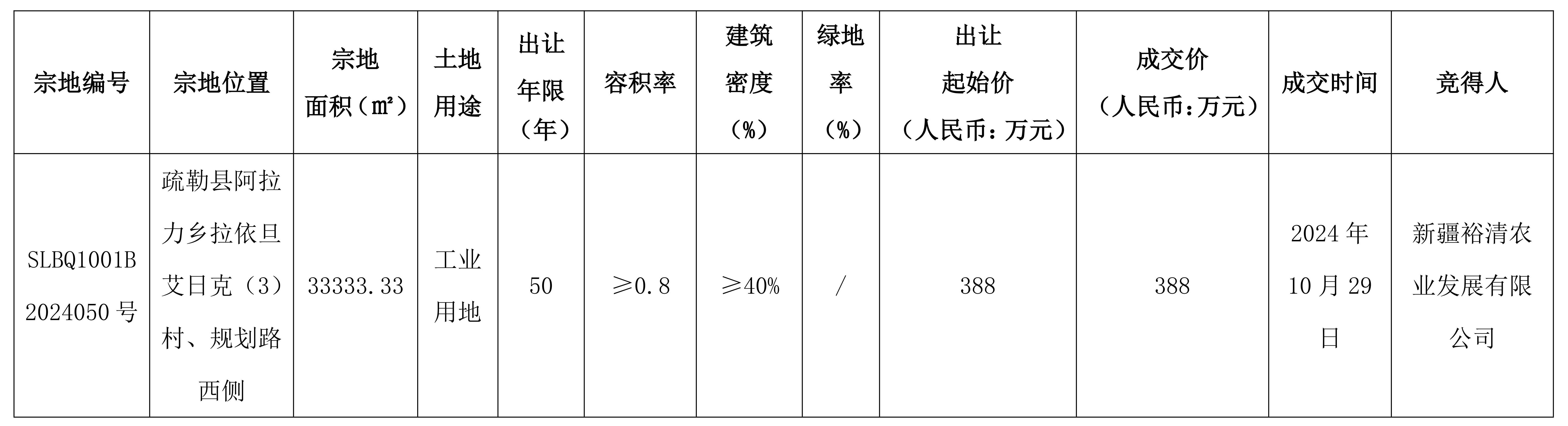 根據(jù)《中華人民共和國土地管理法》《招標拍賣掛牌出讓國有建設(shè)用地使用權(quán)規(guī)定》(國土資源部令第39號)《自治區(qū)深化公共資源交易平臺整合共享工作方案〉的通知》(新政辦函〔2019〕250號)等有關(guān)法律法規(guī)及文件的規(guī)定,疏勒縣自然資源局以掛牌方式出讓1(幅)地塊的國有建設(shè)用地使用權(quán),現(xiàn)將出讓成交結(jié)果公示如下: