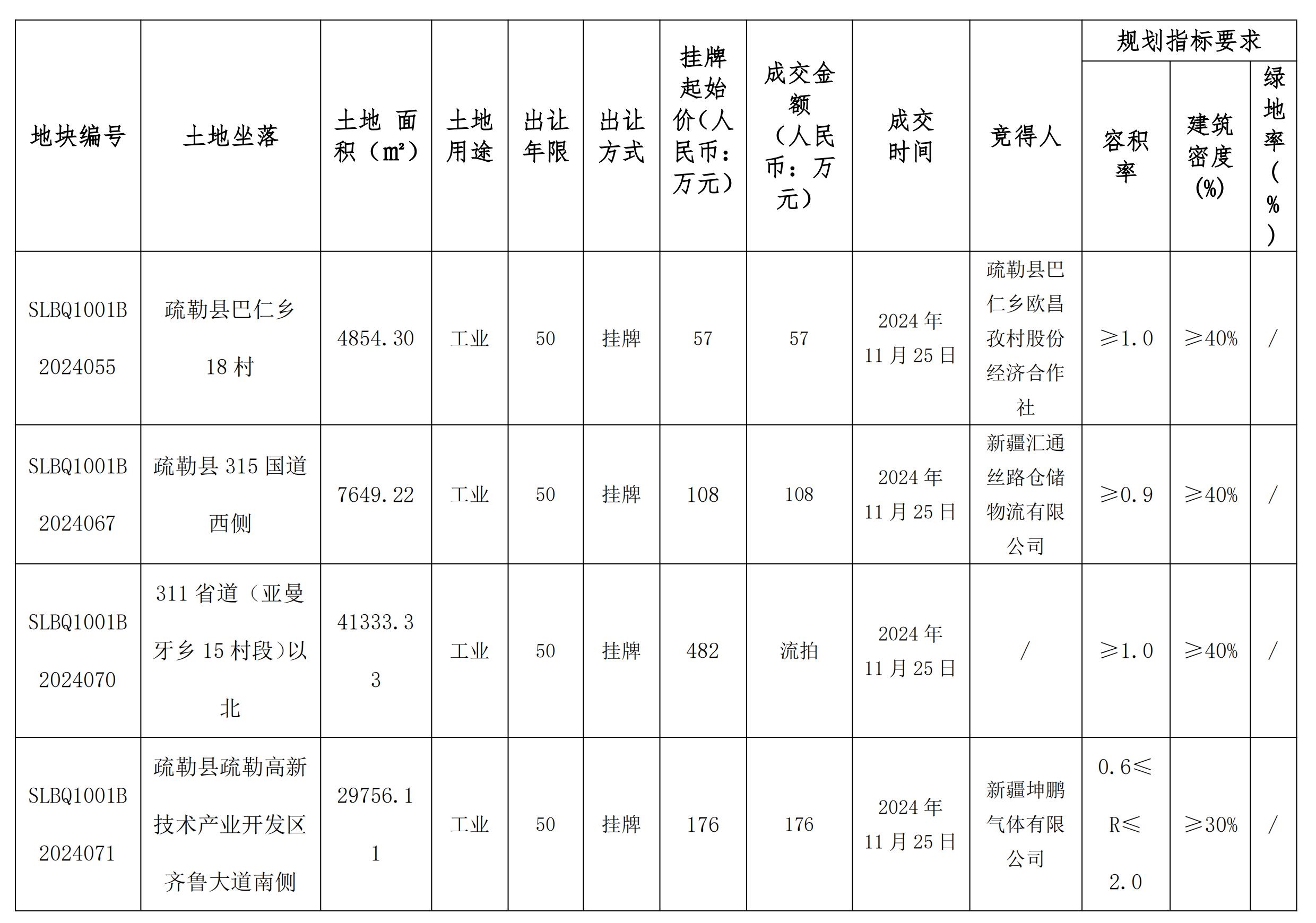 根據(jù)《中華人民共和國土地管理法》《招標(biāo)拍賣掛牌出讓國有建設(shè)用地使用權(quán)規(guī)定》(國土資源部令第39號)《自治區(qū)人民政府辦公廳轉(zhuǎn)發(fā)自治區(qū)發(fā)展改革委《自治區(qū)深化公共資源交易平臺(tái)整合共享工作方案》(新政辦函〔2019〕250號)等有關(guān)法律法規(guī)及文件的規(guī)定,疏勒縣自然資源局以掛牌方式出讓4(幅)地塊的國有建設(shè)用地使用權(quán),現(xiàn)將出讓成交結(jié)果公示如下: