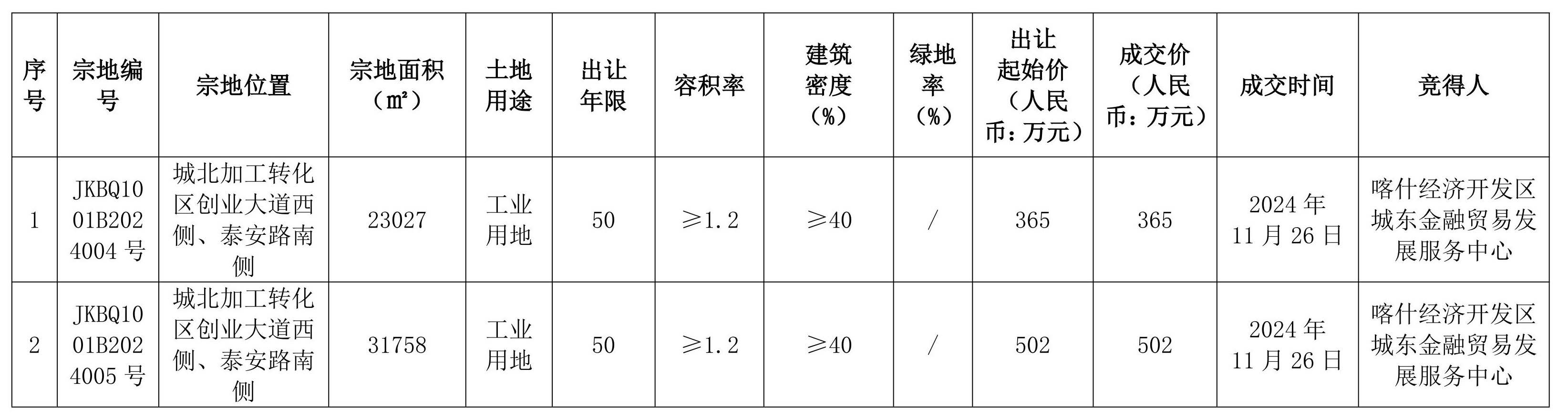 根據(jù)《中華人民共和國土地管理法》《招標(biāo)拍賣掛牌出讓國有建設(shè)用地使用權(quán)規(guī)定》(國土資源部令第39號)《自治區(qū)深化公共資源交易平臺整合共享工作方案〉的通知》(新政辦函〔2019〕250號)等有關(guān)法律法規(guī)及文件的規(guī)定,喀什地區(qū)自然資源局喀什經(jīng)濟開發(fā)區(qū)分局以掛牌方式出讓2(幅)地塊的國有建設(shè)用地使用權(quán),現(xiàn)將出讓成交結(jié)果公示如下: