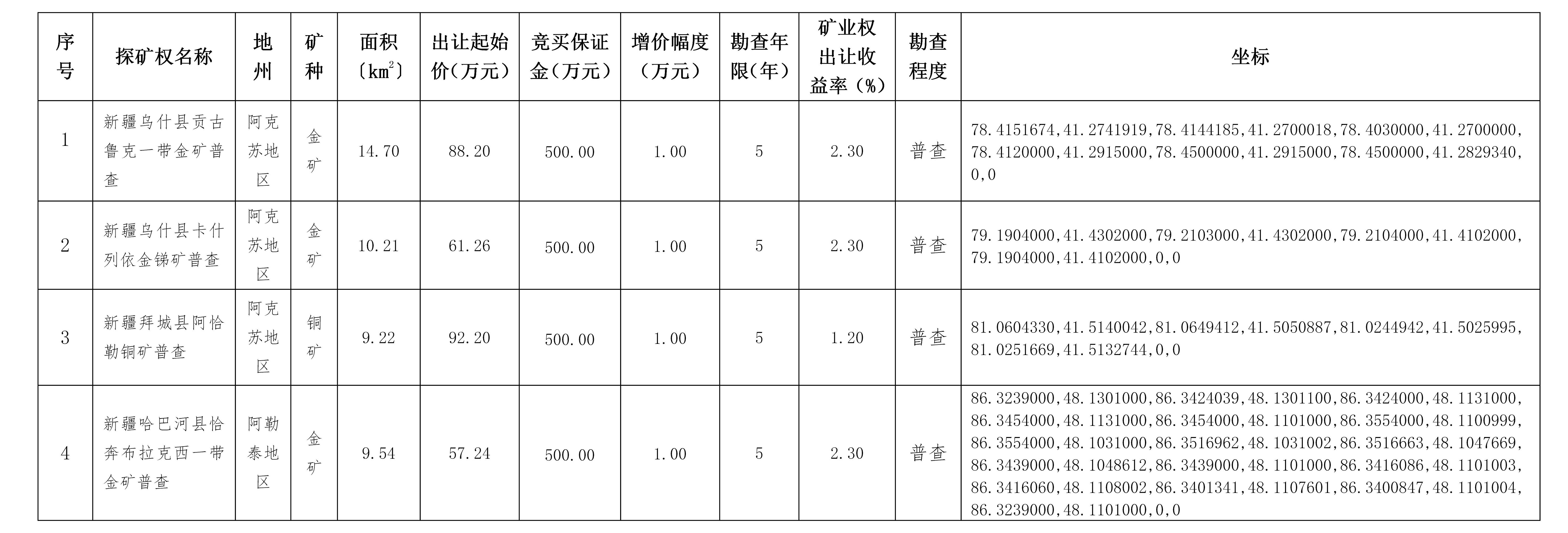 出讓探礦權(quán)名稱、面積、拐點坐標、掛牌起始價、增價幅度等基本情況(見附件1)。