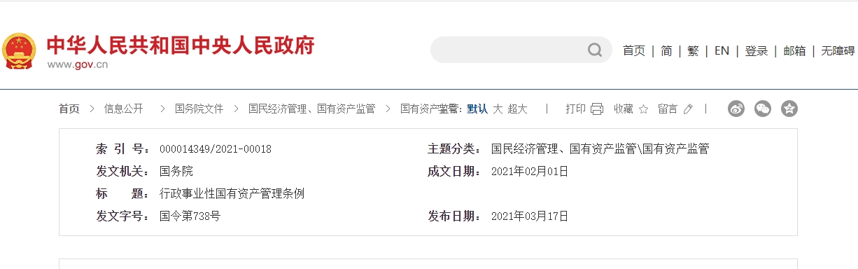 《行政事業(yè)性國有資產管理條例》已經2020年12月30日國務院第120次常務會議通過,現予公布,自2021年4月1日起施行。