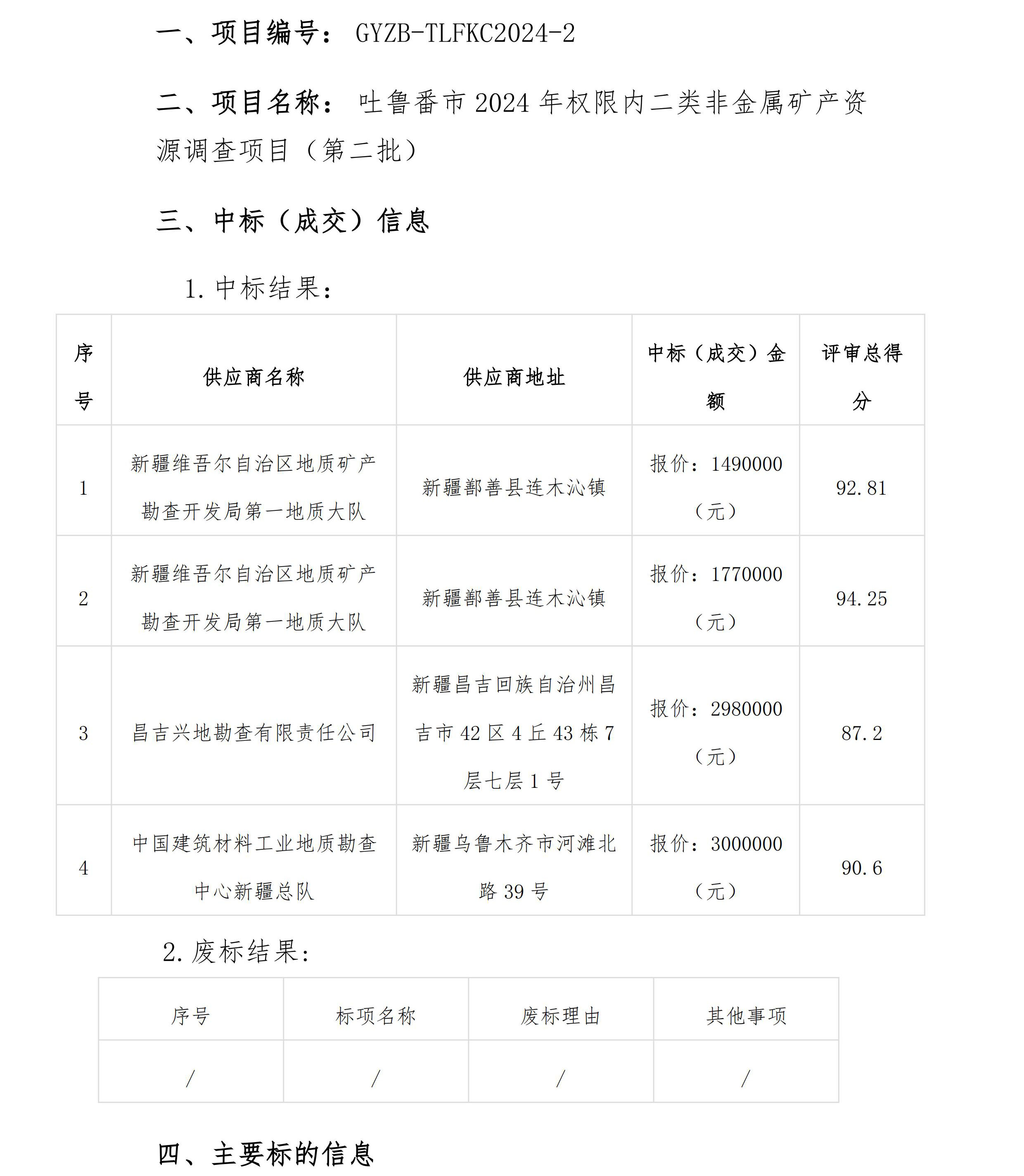 吐魯番市2024年權(quán)限內(nèi)二類非金屬礦產(chǎn)資源調(diào)查項目(第二批)中標(biāo)(成交)結(jié)果公告