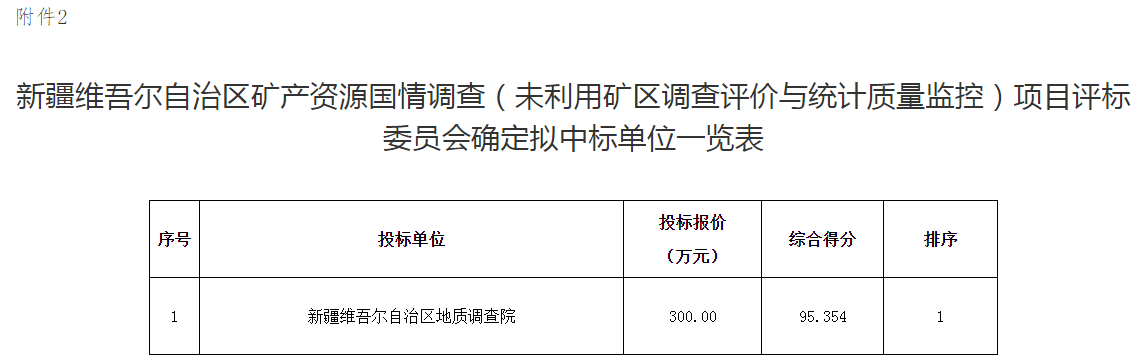 2.新疆維吾爾自治區(qū)礦產(chǎn)資源國(guó)情調(diào)查(未利用礦區(qū)調(diào)查評(píng)價(jià)與統(tǒng)計(jì)質(zhì)量監(jiān)控)項(xiàng)目評(píng)標(biāo)委員會(huì)確定擬中標(biāo)單位一覽表